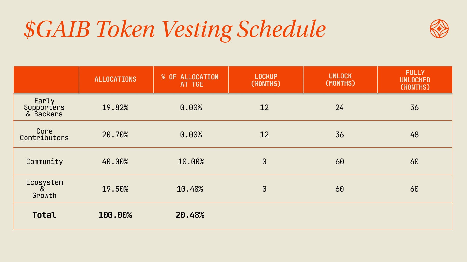 Allocated to early backers and supporters who provided the foundational capital, guidance, and network resources that enabled GAIB’s development. These allocations follow structured vesting schedules to align long-term interests with the protocol’s sustainable growth and the expansion of its Economic Layer ecosystem.